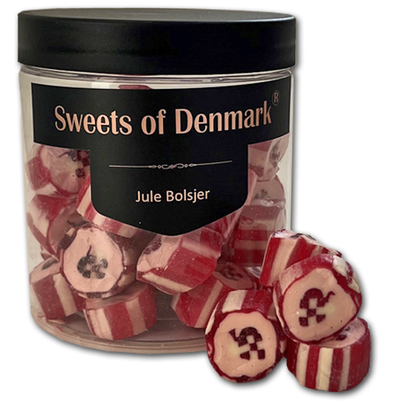 Julebolsjer med motiv af fine små julehjerter. Bolsjerne har en dejlig smag af amaretto